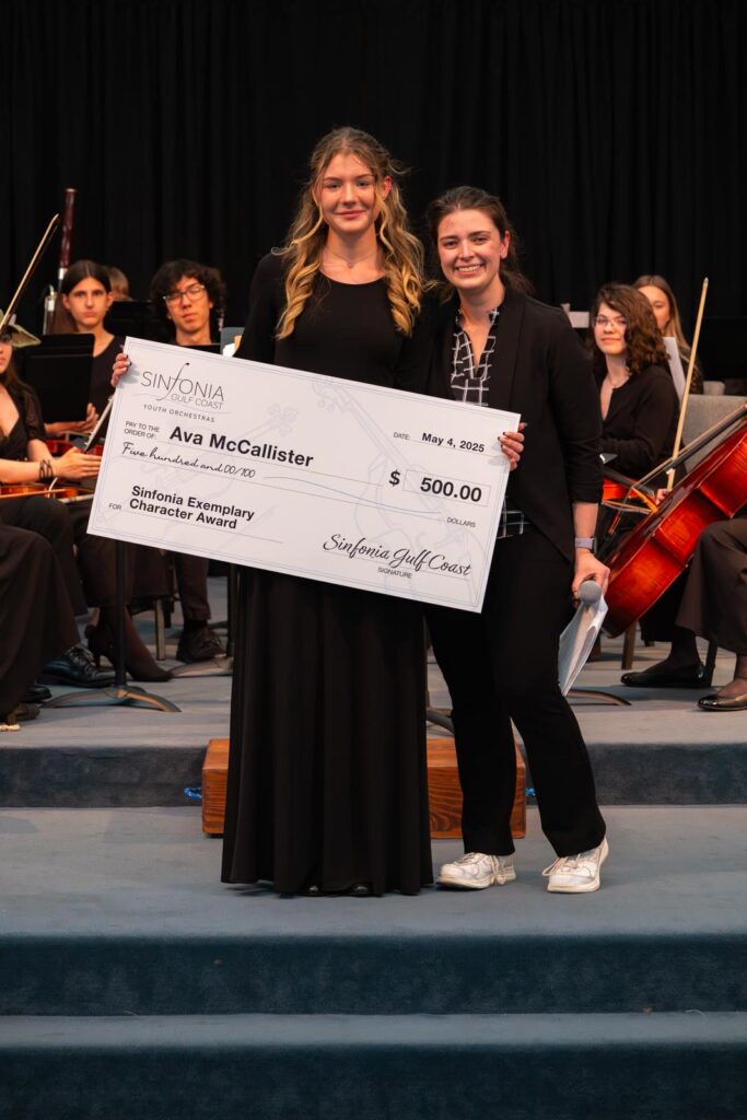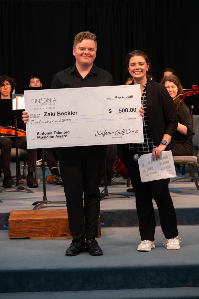 Two additional scholarships were introduced this year, each carrying a $500 award. Ava McCallister, a violinist from South Walton High School, was selected by teaching staff to receive the Exemplary Character Scholarship, which honors a student who consistently demonstrates integrity, compassion, and resilience. The inaugural Talented Musician Scholarship went to Zaki Beckler, a tuba player from Gulf Breeze High School, in recognition of his musical excellence and creativity throughout his time in the program.