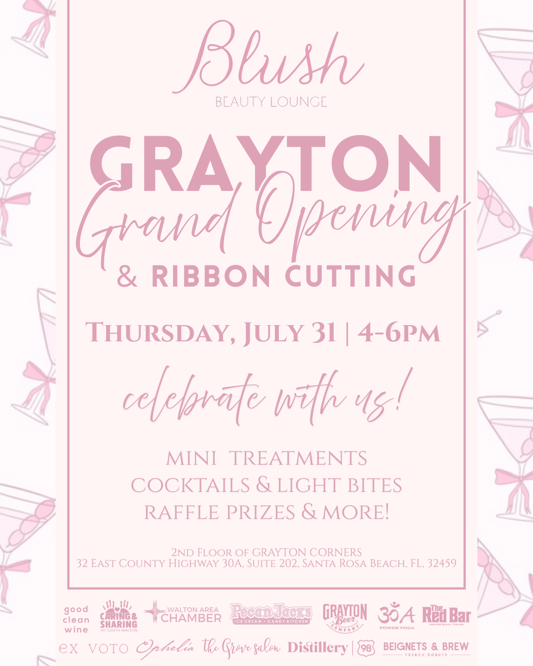 Blush will celebrate their second location with a grand opening party on Thursday, July 31 from 4-6 p.m. They will be joined by the Walton Area Chamber of Commerce for an official ribbon cutting, commemorating the business’ official opening to the community. During the event, guests will enjoy complimentary cocktails, wine from Good Clean Wine, craft brews from Grayton Beer Company, and light bites from The Red Bar and fellow Grayton Corners neighbors, including Pecan Jacks Ice Cream and Candy Kitchen.