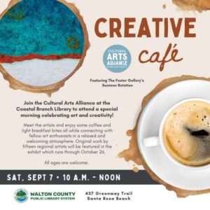 Friends of the Coastal Branch Library & Cultural Arts Alliance of Walton County invite you to Creative Café on Saturday, Sept. 7th from 10am – noon featuring The Foster Gallery’s Summer Rotation at the library. Meet the artists, enjoy some coffee and light breakfast while connecting with fellow art enthusiasts. All ages welcome.